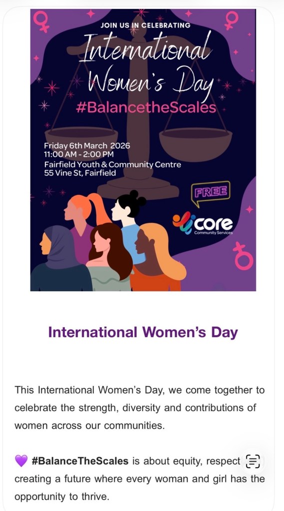 The Australian Arab Cultural Forum attended an invitation from the government organisation CORE to celebrate International Women’s Day on Friday, 6 March 2026. The celebration was attended by a group of women from Australia’s ethnic communities. Several speeches were delivered encouraging women’s empowerment and resilience in facing the challenges of life in diaspora. The celebration also included traditional dances and various entertainment performances.